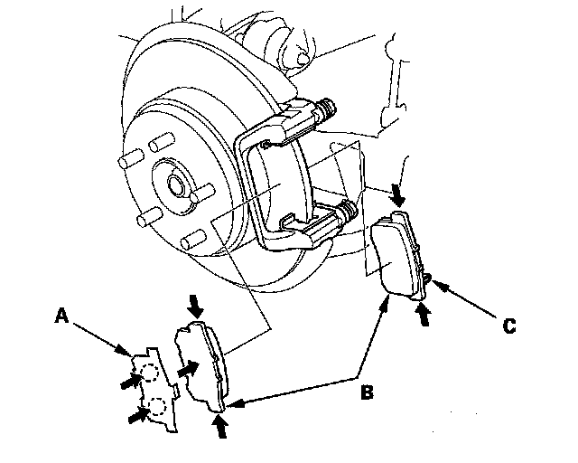 15. Install the brake pads and pad shims correctly. Install the brake pad with the wear indicator (C) on the bottom inside. If you are reusing the brake pads, always reinstall the brake pads in their original positions to prevent a momentary loss of braking efficiency.