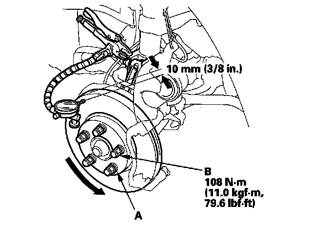 5. Install suitable flat washers (A) and wheel nuts (B), and tighten the nuts to the specified torque to hold the brake disc securely against the hub.