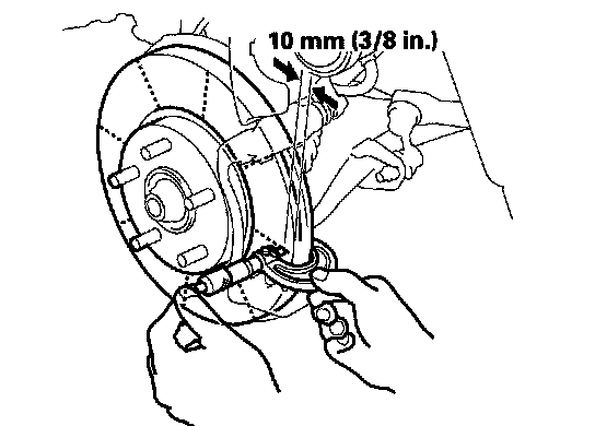 6. Set up the dial gauge against the brake disc as shown, and measure the runout at 10 mm (3/8 in.) from the outer edge of the disc.