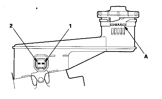 ^ Fill the reservoir with brake fluid to the MAX (upper) level (A). With the float up, there should be no continuity.