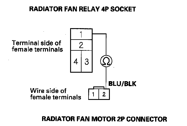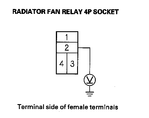 7. Check for continuity between the radiator fan relay 4P socket terminal No. 1 and the radiator fan motor 2P connector terminal No. 2.