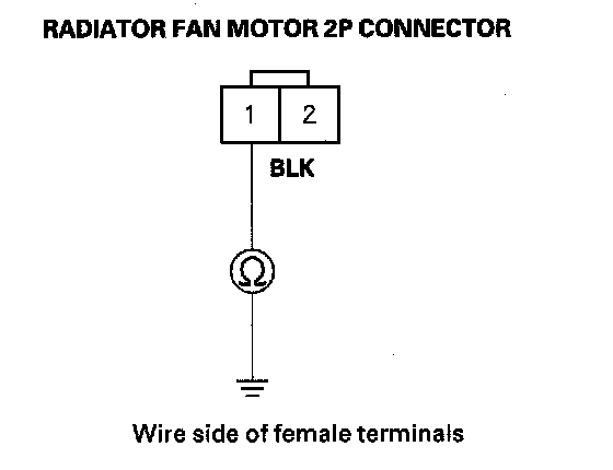 8. Check for continuity between the radiator fan motor 2P connector terminal No. 1 and body ground.
