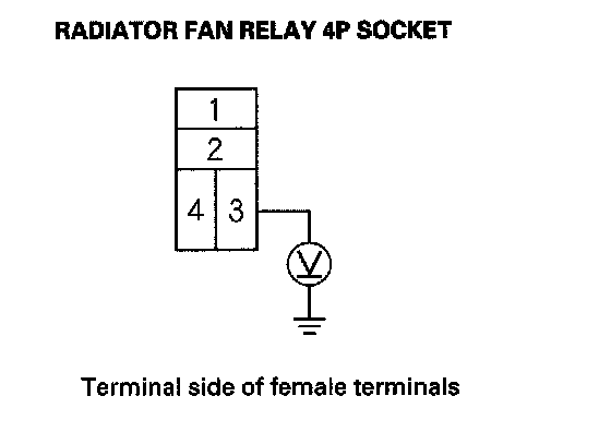 4. Measure the voltage between the radiator fan relay 4P socket terminal No. 2 and body ground.