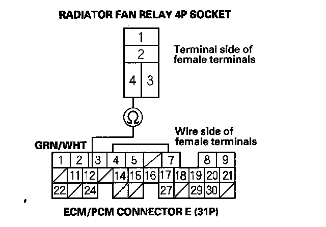 10. Check for continuity between the radiator fan relay 4P socket terminal No. 4 and the engine control module (ECM)/powertrain control module (PCM) connector terminal E12.