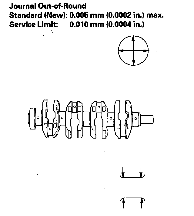 4. Measure out-of round at the middle of each rod and main journal in two places. The difference between measurements on each journal must not be more than the service limit.