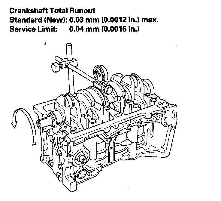 9. Measure the runout on all of the main journals. Rotate the crankshaft two complete revolutions. The difference between measurements on each journal must not be more than the service limit.
