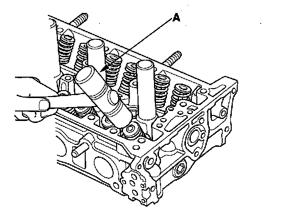 8. Lightly tap the end of each valve stem two or three times with a plastic mallet (A) to ensure proper seating of the valve and valve cotters. Tap the valve stem only along its axis so you do not bend the stem.