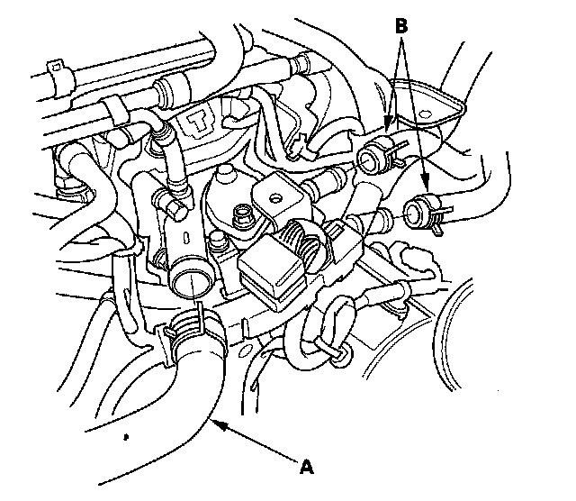 38. Remove the upper radiator hose (A) and heater hoses (B).