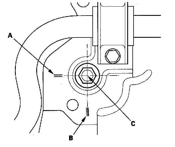 46. Make the appropriate reference lines at positions (A) and (B) that line up with the center of each subframe mounting bolt (C).