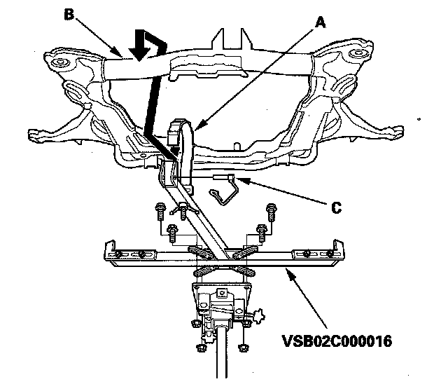 47. Attach the subframe adapter (VSBO2C000016) to the subframe by hanging the belt (A) over the front of the subfame (B), then secure the belt with its stop (C).