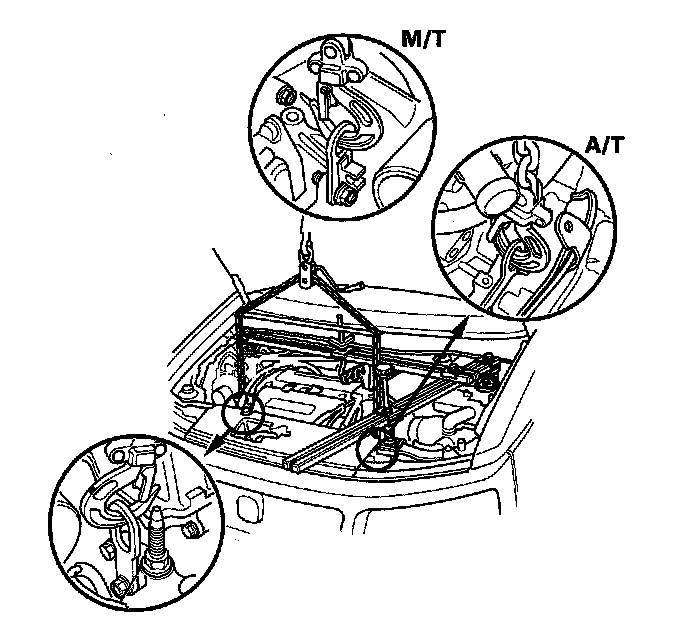 61. Lower the engine/transmission all the way. Remove the chain hoist, universal eyelet and engine hanger/adapter.