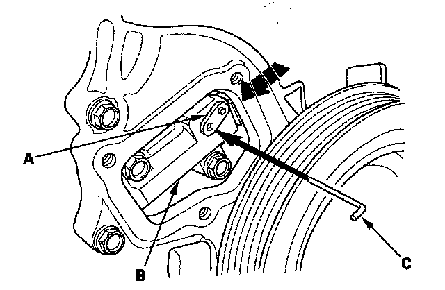 3. Align the holes on the lock (A) and the auto-tensioner (B), then insert a 1.5 mm (0.06 in.) diameter pin (C) into the holes. Turn the crankshaft clockwise to secure the pin.