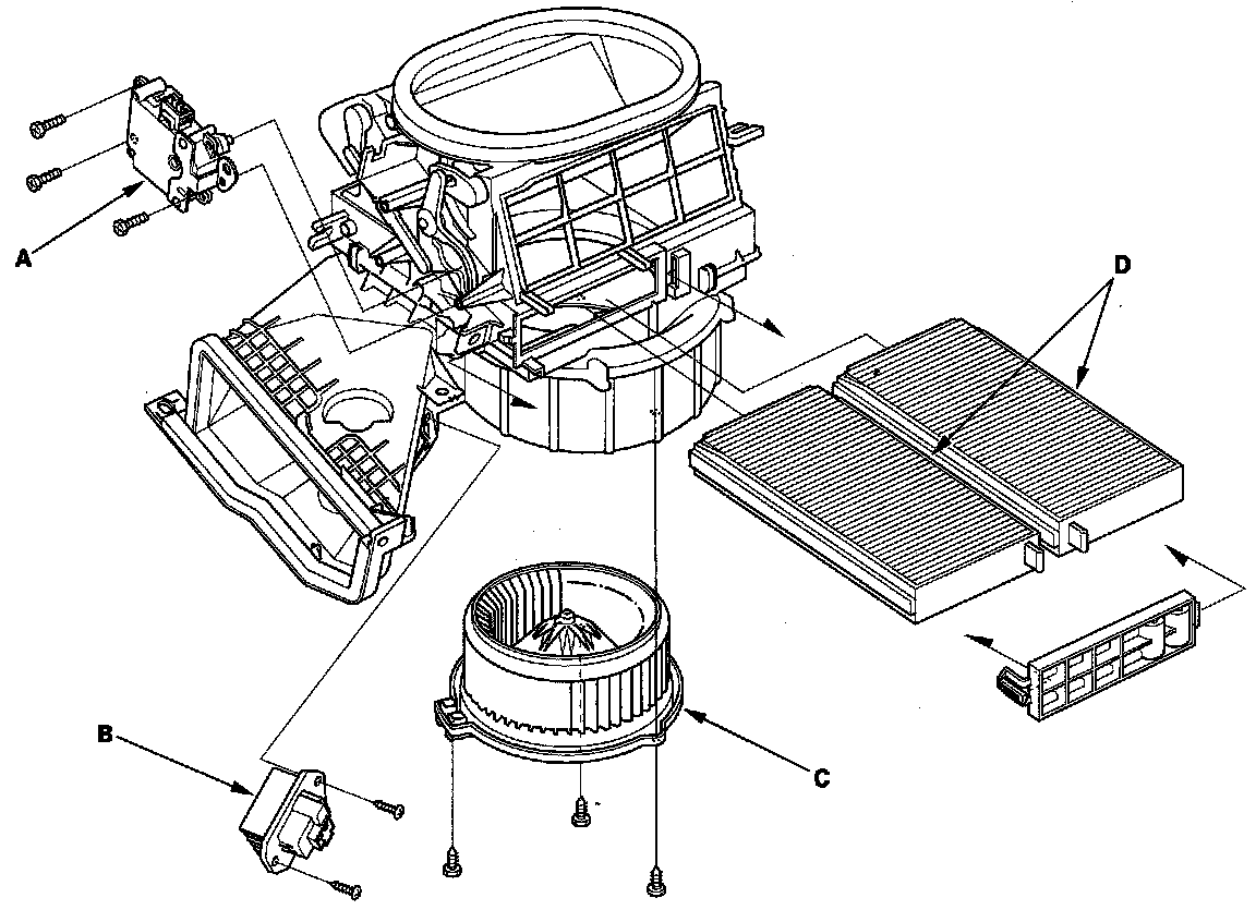 - The recirculation control motor (A), the power transistor (B), the blower motor (C), and the dust and pollen filters (D) can be replaced without removing the blower unit.