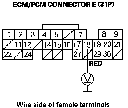 17. Using the backprobe set, measure the voltage between the No. 18 terminal of ECM/PCM connector E (31P) and body ground with the ECM/PCM connectors connected.