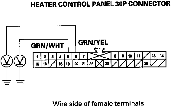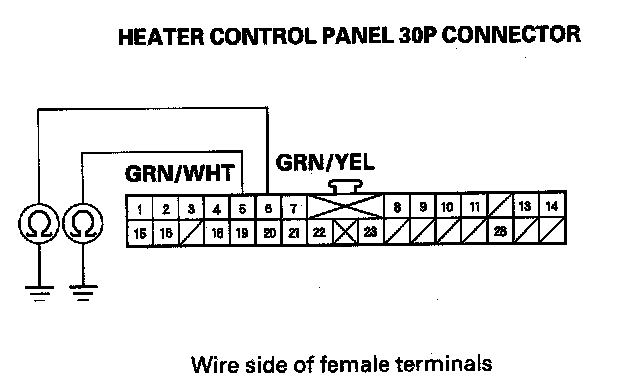 8. Check for continuity between the No. 5 and No. 6 terminals of the heater control panel 30P connector and body ground individually.