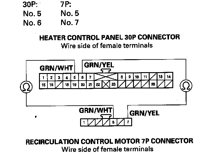 11. Check for continuity between the following terminals of the heater control panel 30P connector and the recirculation control motor 7P connector.