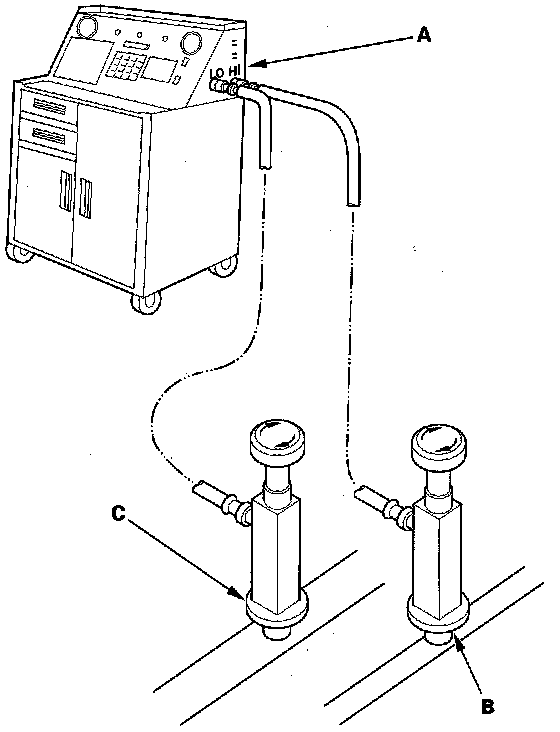 1. Connect an R-134a refrigerant recovery/recycling/charging station (A) to the high-pressure service port (B) and the low-pressure service port (C), as shown, following the equipment manufacturer's instructions.
