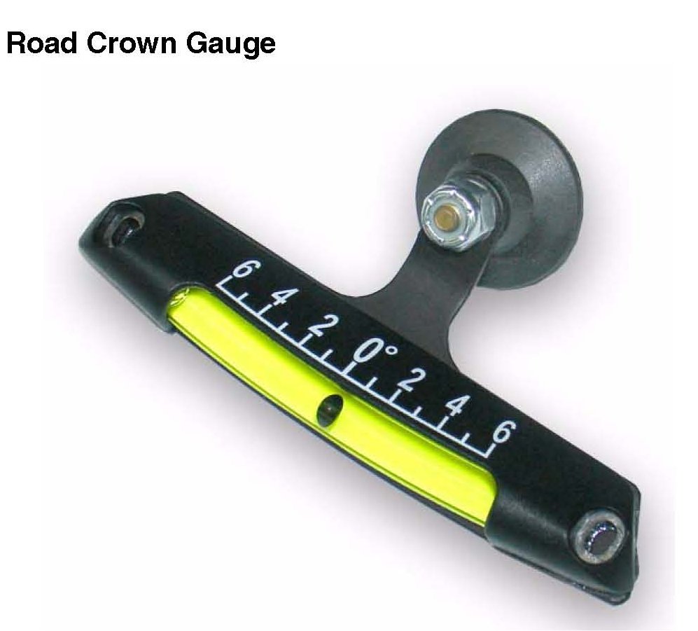 The road crown gauge measures the amount of road crown. Almost all roads have a crown to help drain water during rainstorms. Use the suction cup to attach the road crown gauge bracket to the vehicle in a vertical position. If necessary, bend the bracket until the gauge is vertical. Once you attach and align the road crown gauge, calibrate the gauge to zero. There are two ways to calibrate the gauge: