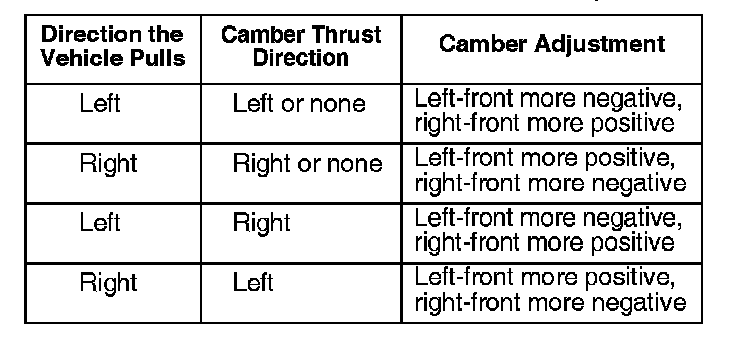 3. Determine how the front wheel camber is affecting the pull. Pick the combination of left- and right-front camber that best matches the vehicle you are repairing, then note the camber thrust direction for that combination: