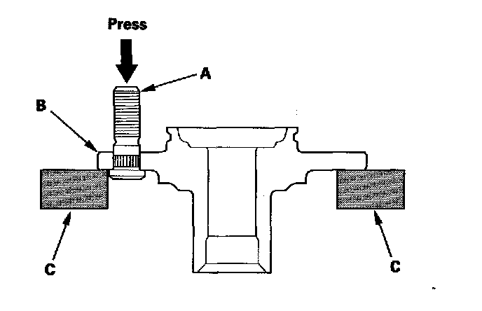 2. Separate the wheel bolt (A) from the hub (B) using a hydraulic press. Support the hub with hydraulic press attachments (C) or equivalent tools.