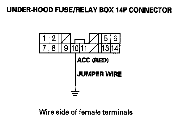 9. Momentarily connect under-hood fuse/relay box 14P connector terminal No. 10 to body ground with a jumper wire several times.