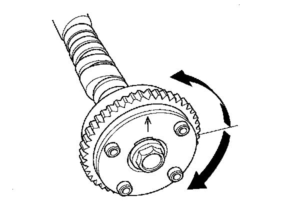 5. Check that the variable valve timing control (VTC) actuator is locked by turning the VTC actuator counterclockwise. If not locked, turn the VTC actuator clockwise until it stops, then recheck it. If it is still not locked, replace the VTC actuator.