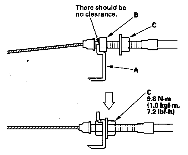 9. Position the adjusting nut on the other side of the bracket, then tighten the locknut (C).