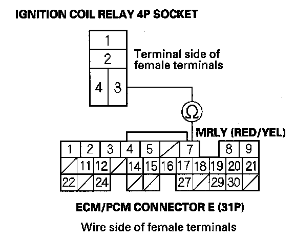 11. Check for continuity between ignition coil relay 4P socket terminal No. 3 and ECM/PCM connector terminal E7.