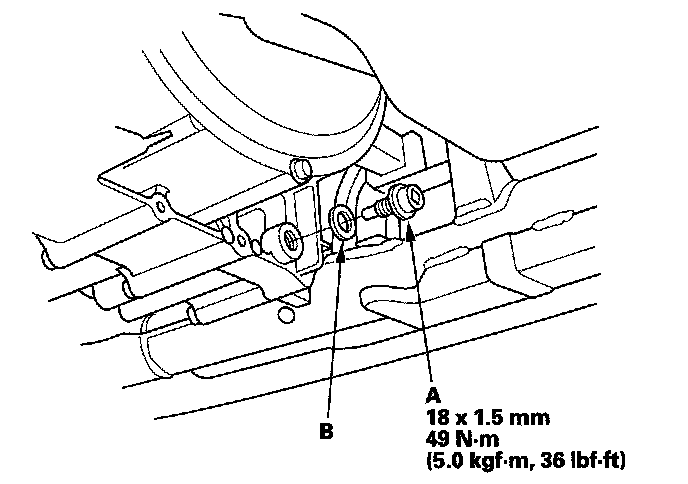 18. Install the ATF cooler inlet line with the line bolt and the new sealing washers. Create clearance with the jack between the transmission and the front subframe to tighten the line bolt to the specified torque with the torque wrench.