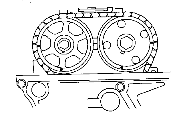 2. Set the No. 1 piston at top dead center (TDC). The punch mark (A) on the variable valve timing control (VTC) actuator and the punch mark (B) on the exhaust camshaft sprocket should be at the top. Align the TDC marks (C) on the VTC actuator and exhaust camshaft sprocket.