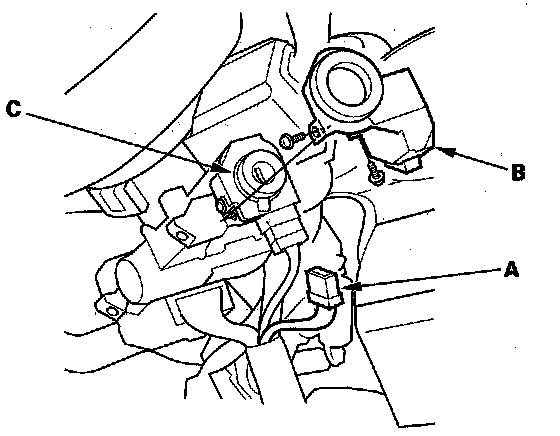4. Remove the two screws and the immobilizer control unit-receiver from the ignition key cylinder (C).