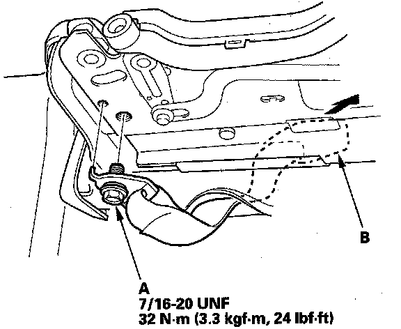 3. Remove the center anchor bolt (A), and pull the seat belt buckle (B) out, then remove it.