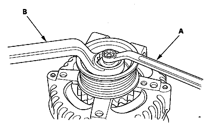 3. If the front bearing needs replacing, remove the pulley locknut with a 10 mm wrench (A) and a 22 mm wrench (B). If necessary, use an impact wrench.