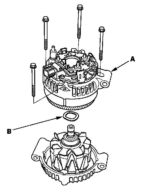 7. Remove the four bolts, then remove the rear housing assembly (A), and washer (B).
