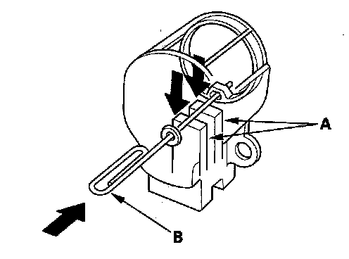 19. Push in the brushes (A), then insert a pin or drill bit (B) (about 1.6 mm (0.06 in.) diameter) to hold them there.