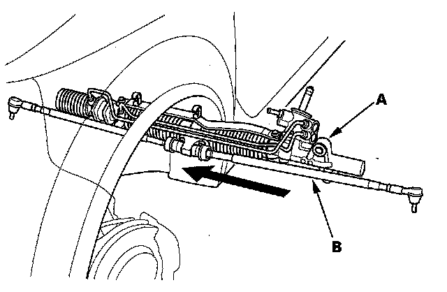 3. Carefully move the steering gearbox toward the passenger's side until the pinion shaft (A) clears the wheelwell opening (B) on the frame. Continue moving the gearbox toward the passenger's side until the steering gearbox is in position.