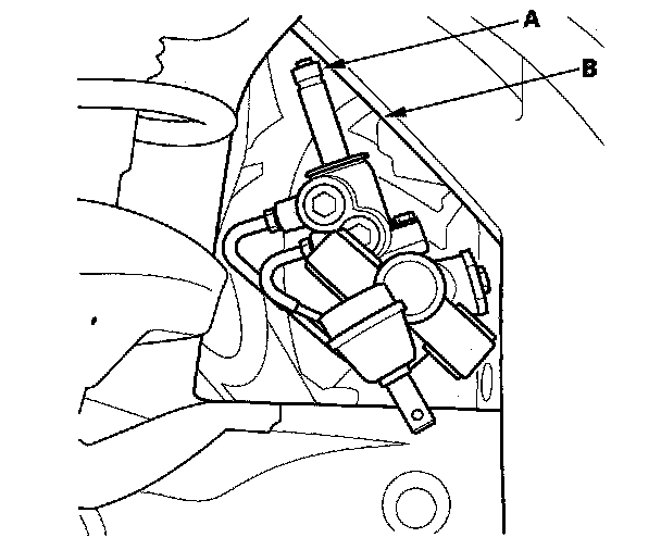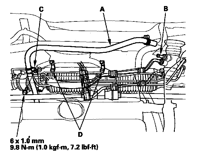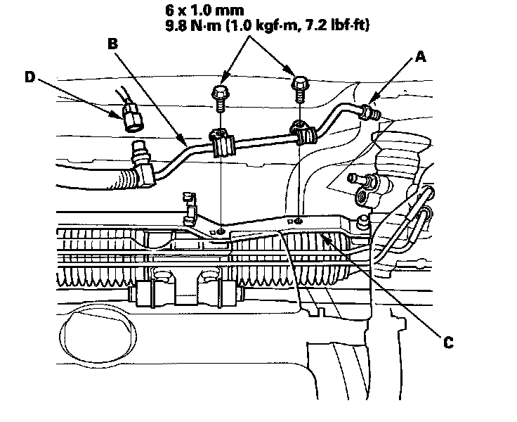 12. Loosely connect the 14 mm flare nut (A) to the valve body unit, and install the feed line (B) on the P/S line mounting bracket (C). Connect the power steering pressure switch connector (D).