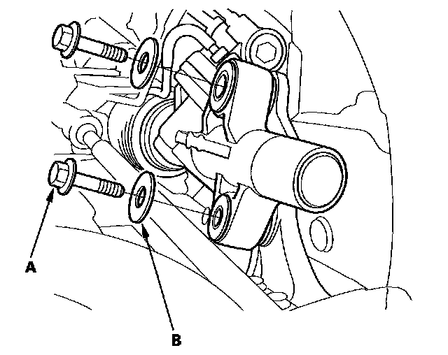 6. Loosely install the two 10 mm flange bolts (A) and washers (B) on the left side of the gearbox.