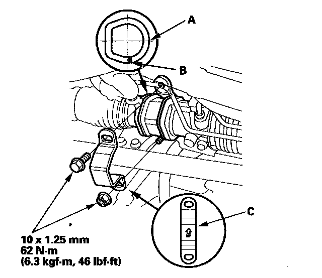20. Install the steering joint (A), and reconnect the steering shaft (B) and pinion shaft (C). Make sure the steering joint is connected as follows: