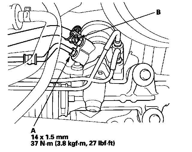 15. Tighten the 14 mm flare nut (A) to the specified torque value, and tighten the adjustable hose clamp (B).