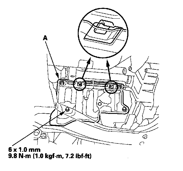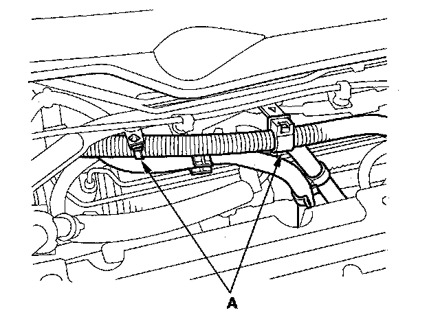 16. Reinstall the engine wire harness clamp and clip (A) to the mounting brackets.
