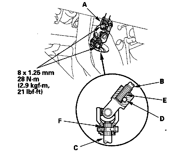 ^ Slip the lower end of the steering joint onto the pinion shaft (line up the bolt hole with the groove (F) around the shaft), and loosely install the lower joint bolt. Be sure that the lower joint bolt is securely in the groove in the pinion shaft.