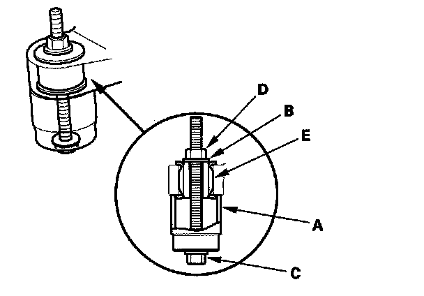 3. Hold the flange bolt with a wrench, and tighten the nut with a wrench. Remove the gearbox mount cushion (E).