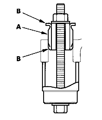 6. Install the gearbox mount cushion by tightening the nut until the mount cushion edges (B) properly fit on the gearbox flange surface.