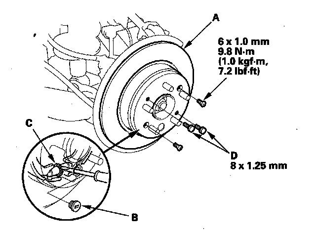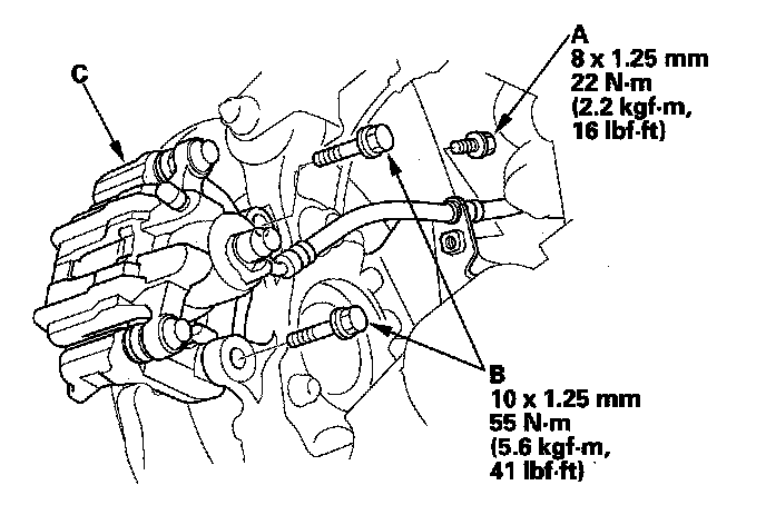 5. Remove the caliper bracket mounting bolts (B), and hang the caliper (C) to one side. To prevent damage to the caliper or brake hose, use a short piece of wire to hang the caliper from the undercarriage.