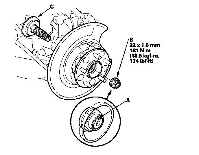 7. Raise the stake (A) of the spindle nut (B), then remove and discard the nut. Remove the rear axle shaft (C) from vehicles with 2WD.