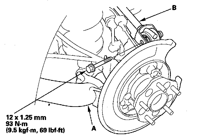 12. Remove the flange bolt, and disconnect the upper arm (B) from the knuckle.