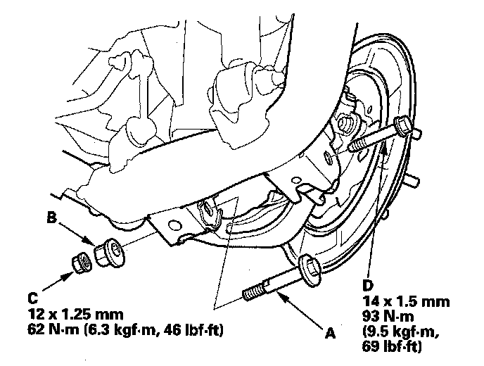 ^ If the brake drum has clung to the hub bearing unit. Screw two 8 x 1.25 mm bolts (D) into the brake disc/drum to push it away from the hub bearing unit. Turn each bolt 90° at a time to prevent cocking the brake disc/drum.
