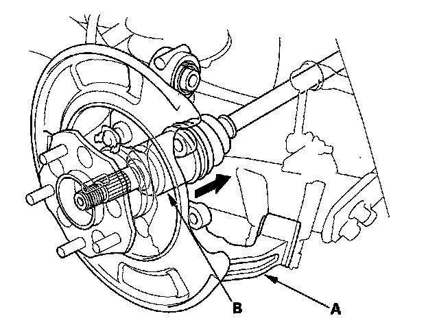 15. Remove the knuckle (A) while pushing in the driveshaft and holding the driveshaft outboard joint (B) (4WD only).
