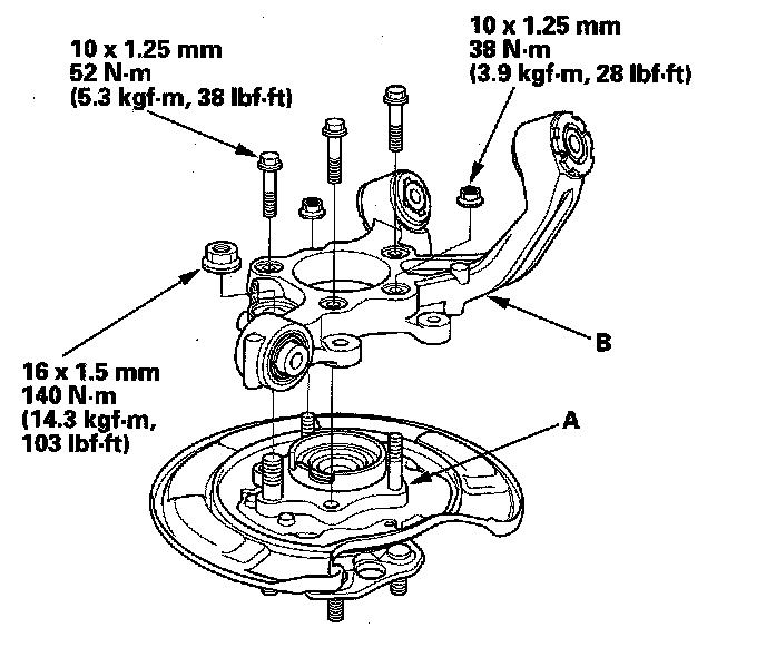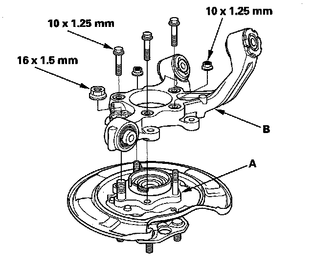 2. Separate the bearing unit (A) from the knuckle (B).